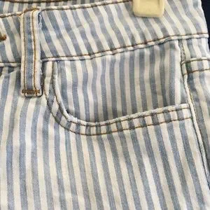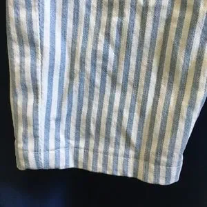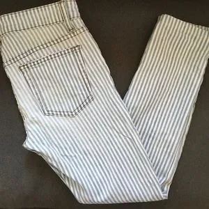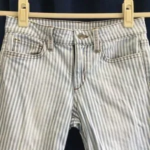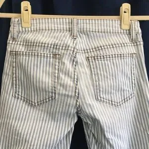 Soft blue and white striped skinny jeans from Joe’s Jeans. Cropped length. Light distressing along pockets, as shown in final two photos, and light fade along thighs. Contains 2% spandex for a bit of stretch. Joe’s Jeans retail at Anthropologie, Nordstrom, Saks, Neiman Marcus, etc.