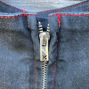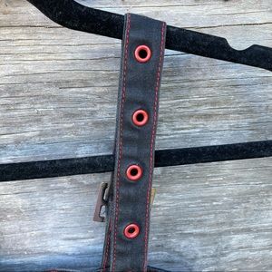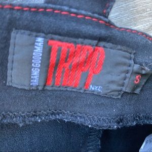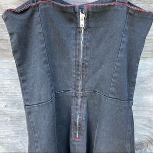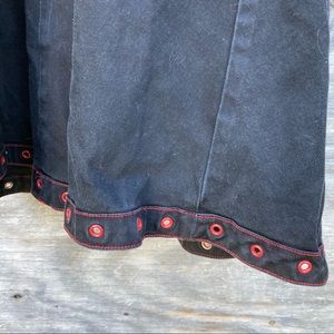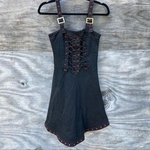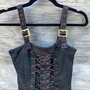 Vintage Tripp NYC goth style dress features double corset lacing on front, adjustable buckle straps, red grommets with silver hardware, back zipper closure, black denim like material with some stretch. GUC, RARE style, vintage. Minor wear.
