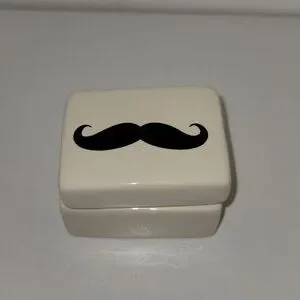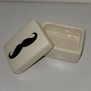 small ceramic trinket box with a black mustache accent
