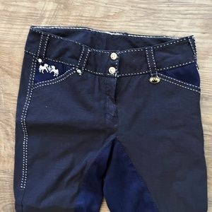 The ultimate schooling breeches for Dressage riders! The Equine Couture Ladies Blakely Full Seat Breeches are soft and stretchy and have just enough bling with crystal detailing on the front closure. The wide waistband gives a flattering fit with other features including, a front zipper, open front pockets, and our classic suede UltraGripp full seat for stick ability. These breeches are traditional with all of the features you need without hindering your ride. Find the most stylish horse riding apparel for equestrian fashionistas under the Equine Couture label. Equine Couture offers affordable yet fashion-forward apparel for women and children. Care Instructions: Turn inside out and wash with warm water (medium temperature) and mild detergent. Tumble dry low, no bleach, must wash separately.