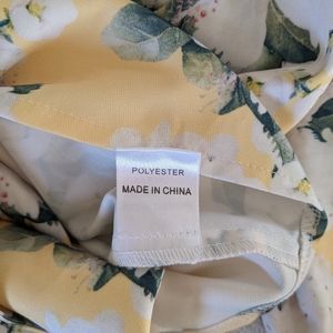 Plunge neckline, long sleeves, rouched puff sleeves, front-tie detail, cropped length and silk-feel fabric. Pale yellow background with white flowers and foliage.