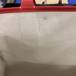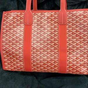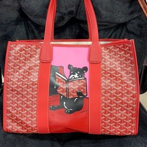 New with slight inside wear jumbo size Goyard limited edition tote bag in red with bright pink. Dog reading a book design on front.