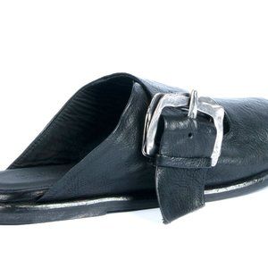black leather sandal with back strap and brushed metal Silver buckle