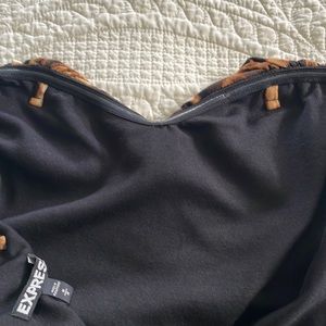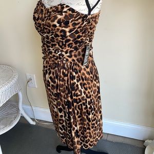 Express Brown and Black Animal Print Midi Dress. New with tags. Strapless but includes straps. Lining is solid black. Zipper and small clasp on back of dress. Small wear spot at top of zipper near clasp. See picture. Other than that, good condition. Size M