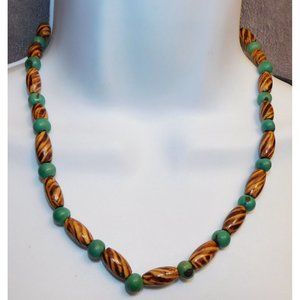 Men's wooden necklace. It's on a black thread with a button style clasp. It has an alternating pattern of striped wooden barrel beads, and turquoise dyed round beads. This is a great 90s necklace, perfect for summer and the beach!