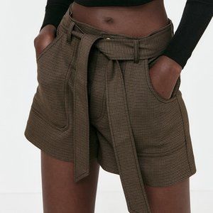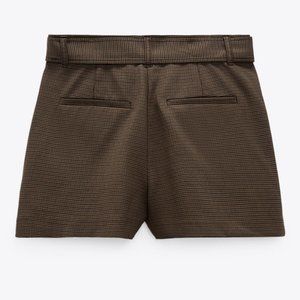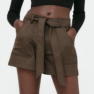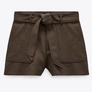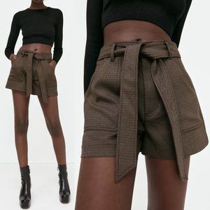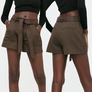 NEW Zara Houndstooth Checker Plaid High Waist Self Tie Belt Shorts Dark Brown S
