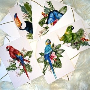 Handcrafted Set of Five “Amazonia Series” Elegant Watercolor Art Prints Greeting Cards, Postcard Style with High-Quality Luxury Envelopes Featuring Gold Border and Quick Self Seal.