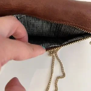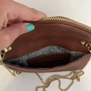 Chain crossbody, brown faux, vegan leather bag with three zippered sections. Top envelope fold opens up and has a bigger compartment for items!