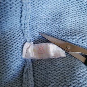 Colour pale blue. Material 100% cotton, medium weight, season spring, summer, autumn. Condition cuff and hem edge is paler than the rest of the sweater, first signs of wear, bit of pilling. Washing info. machine wash, see photo, used with lots of wear remaining.