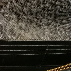Clutch is excellent condition. Inside has two long open pockets. One long cash pocket with 6 card slots. One zipper pocket.