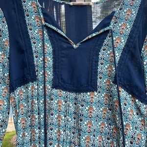 Peasant style blouse size small. Colors of blue brown turquoise and beige. Pretty lace work done in the top shoulders and back.