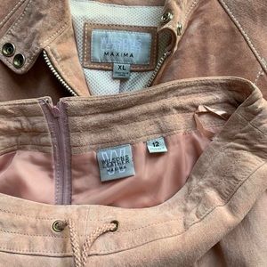I absolutely love this feminine twist on a leather set. Pastel pink suede leather cargo pants and jacket. The pants zip in the back but also have a drawstring. Pants are labeled a 12, jacket is XL. In great condition