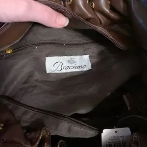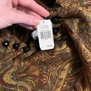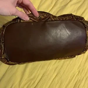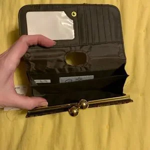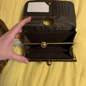 Beautiful set, nice colors. Cloth bag& wallet with faux leather handles & top. Purse has large zippered middle compartment, small zippered pocket, & smaller side slots for lipstick, etc. Wallet has 6 card slots & snap close compartment for money. NWT