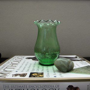 Eye-catching small 5.5" Green Glass Bloom Flower Vase. Preowned, Good condition!