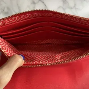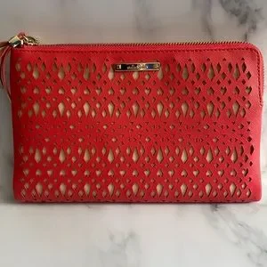Coral clutch. Excellent condition. Has a mirror inside and two zippered sections one with card slots