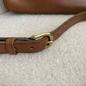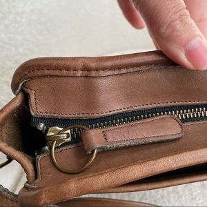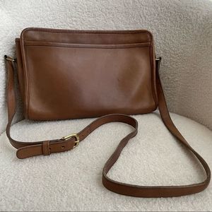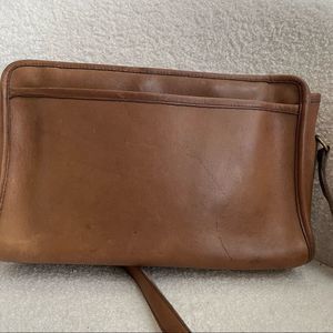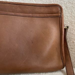 Pre-1994 Vintage Coach swagger shoulder bag in (I think it’s Tabac). Adjustable strap. Clean interior with single zip pocket for closure. 12”x7.5”x4”. Some mars to the exterior leather which it typical of glove tanned cowhide. 3 corners in great shape, 1 corner is in rough shape. See pictures for details. Brass hardware.