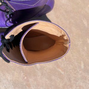 The Eleanor is a true Victorian leather short boot and are sure to attract attention. Onlookers will be envious of this hand dyed pair in Poison Rustic (rich purple). Marvel in the artistry of an embossed leather outsole. Made with a Goodyear welt outsole, and 9 hole lace up shaft this alluring beauty is sure to become a standout pair.