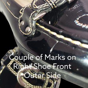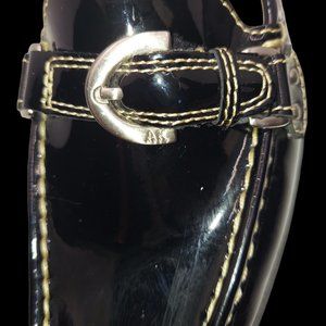 Anne Klein black patent loafer in very good used condition. Minimal wear. This loafer features skid resistant soles, tan stitching around the shoe, and silver buckle on the top.