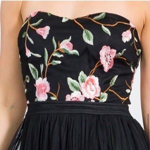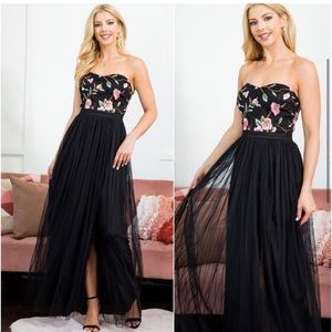 Details - flora upper bodice, built in padding with anti slip grip, zippered back closure, chiffon mesh overlay, fully lined, high slit, rich black color, maxi length, sweetheart neckline