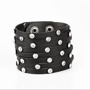 A thick black leather band has been spliced into numerous black strands. Featuring sleek silver frames, glittery white rhinestones are sprinkled across the leather bands for a sassy finish. Features an adjustable snap closure.