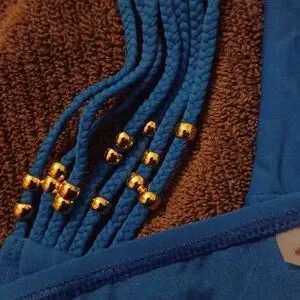 NWT, Bali Blue, Braided Santa Clara teeny, lined, strappy sides with gold Bead details, ruching at back