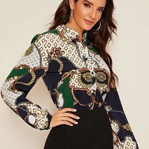 geometric chain print v-neck shirt buttons down long sleeves multicolored 100% polyester fits perfect according to size