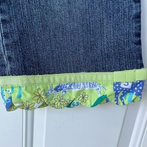 This is a cute pair of trimmed blue jeans from Lilly Pulitzer, girl’s size 10. The denim fabric, 78% cotton/20% polyester/2% spandex, has light fading (seen on photos of this item that are NWT) for a comfortable look. Features a scalloped hem with blue and green “Derby” pattern fabric and grosgrain ribbon, five pocket styling, front zipper/snap closure and interior adjustable elastic inserts for a perfect fit! Your young one will love wearing jeans with a touch of Lilly!