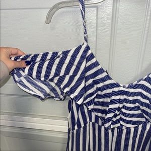 Brand new w tags blue & white wide leg romper. Adjustable spaghetti strap ruffled top. 100% Light weight Rayon material. Comfortable & classy summer outfit โ๏ธ๐๐