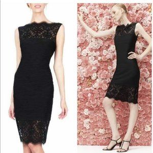 Stunning LBD from Tadashi Shoji displays exquisite lace detail at top and hem while the pintucking flatters your curves to head-turning effect. Depending on your mood (and the crowd), wear pale or bold lips.