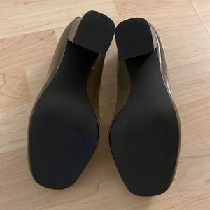 Sz. 8.5 Levity ‘Nicolo’ patent leather penny-loafer heel in taupe.