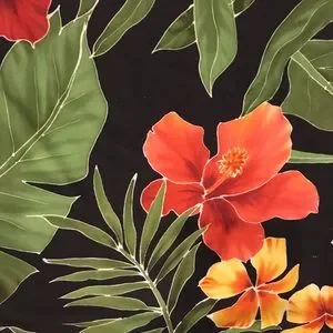 Fabric is black with multicolor hibiscus flowers and monstera leaves