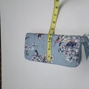 This wallet/wristlet is in excellent condition. It's a cherry blossom pattern on a light blue background.