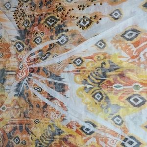 This fabric is thin and see through. A shirt underneath will be needed. There are orange embellishments on the left side. Areas look like tears but are apart of the design and not actually torn.