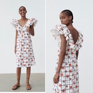 This Zara White Black Floral Lattice Ruffle Sleeve Dress - NEW -