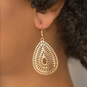 Rippling with grate-like stenciled detail, a shiny gold teardrop frame swings from the ear for a seasonal look. Earring attaches to a standard fishhook fitting.