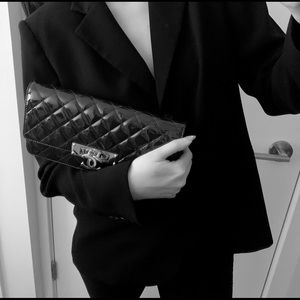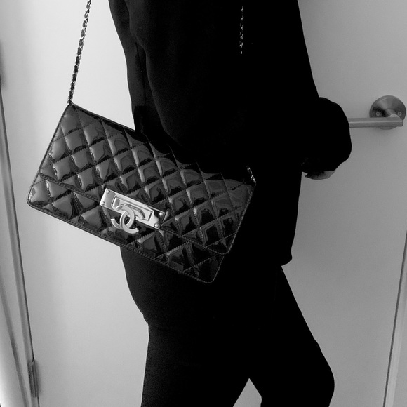 This stylish flap bag is undoubtedly a fashionista's choice! Crafted from patent leather in their quilt design, this black bag features the signature CC on the front flap. It comes with an interwoven chain strap and a fabric lined interior that houses multiple card slots, a zip pocket and an open compartment to neatly organise your belongings.