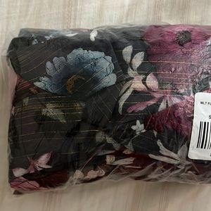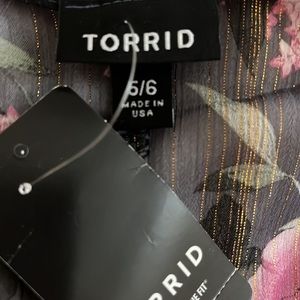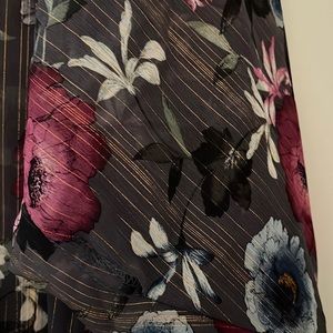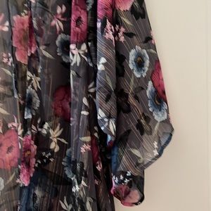 BRAND NEW WITH TAGS TORRID brand floral kimono. It’s subtle metallic detail gives this breezy kimono a shimmery effect. The billowy fit falls delicately over curves and layers over your outfits to give you a little bit more flair. It is semi sheer and I tried to take a pic showing that with my hand. It’s just gorgeous with all of the pink and blue flowers that just POP with color against the beautiful gray/slightly shimmering material. The arms openings are generous and they lay gently giving them a flowing look with absolute comfort and a whole lot of FUN! It can be used for a day to night look, as a swim suit cover up cover up or even in the bedroom as it can be dressed up or shall I say down….for the bedroom. The front hemline is a bit shorter than the one in back slowly lengthening while the fabric. It is a Torrid size 5/6 and that typically equates to a size 28/30. I have to say that I am roughly a size 20/22 - Torrid size 3 - and when I put it on…I feel very much like it fits me. The material falls and flows so nicely that it honestly fits SO many sizes. It measures roughly 26” armpit it armpit but it adjusts to the shape and size of your body accommodating SO many people. It’s highest hemline is roughly 41” and 45” is the longest length.