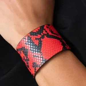 Featuring vibrant red and black python print, a thick black leather band wraps around the wrist for a wild fashion. Features an adjustable snap closure.