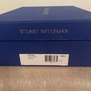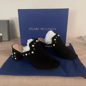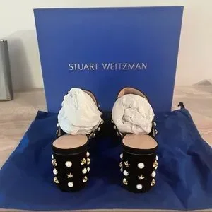 Stuart Weitzman Dohickey Embellished Suede Mule Sandal. Studded block heels in black size 8. fit true to size. 2 inch heel height. only worn once - excellent condition. no missing studs. includes box, dust bag and bag of extra studs.