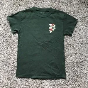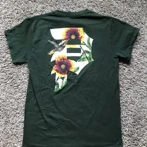 “P” on upper left chest, hummingbird graphic on back