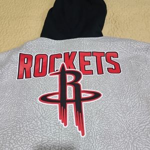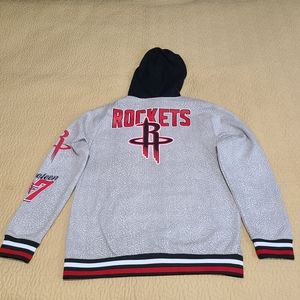 NBA Houston Rockets lightweight jacket. Elephant print color way with embroidered patch logos on front and team logo on back and arm. Features hood and 2 front pockets. Size L, in excellent used condition.