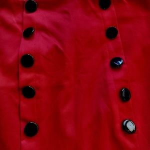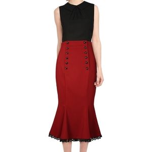 Deep red, satin-look, low sitting mermaid, pencil, knee length skirt with black buttons and black lace trim. Invisible zipper at centre of back. Last three photos are the best representation of the colour.