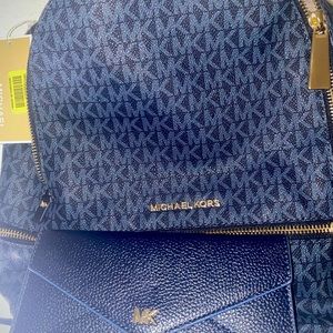 Michael Kors MK Blue Rhea Backpack, Tri-Fold Wallet, & Drawstring Bag Set