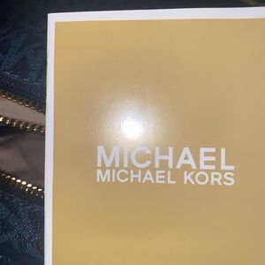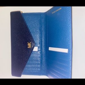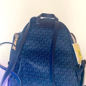 This new, never worn, authentic Michael Kors set includes the Rhea backpack, slim envelope tri-fold wallet, and white linen MK drawstring bag. The set (backpack and wallet) are color matched royal blue with the signature gold-color (MK logo, zippers).