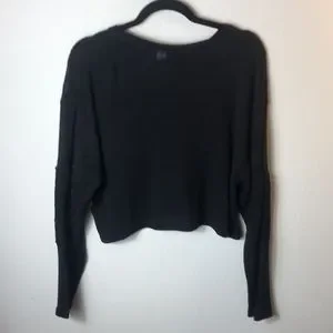 This gorgeous black cropped sweatshirt from Divided by H&M features long sleeves, and beautiful lace detailing across the front and down the sleeves. It’s also mildly sheer and is super cute to throw over anything, while being unique with the lace bust and sleeve detail! It has some very small, unnoticeable dots on the bottom hem, as pictured in the fourth photo. I’ve reflected this in the listing price.