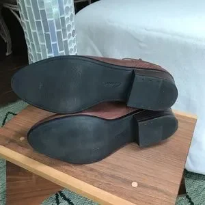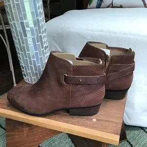 This is a rich dark cognac funky distressed boot with suede snakeskin on the back and wrapped strap detail. Burnished toe. Distressed markings are intentional to the look of the boot and I added a scuff or two. About 1 1/2” heel Awesome comfortable boot! Fun pair for the fall.
