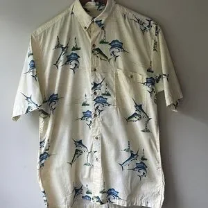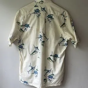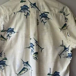 Hook & Tackle Outfitters All Over Swordfish Lighthouse Nautical Fishing Map Print Button Down in Men's Size Medium in EXCELLENT CONDITION.