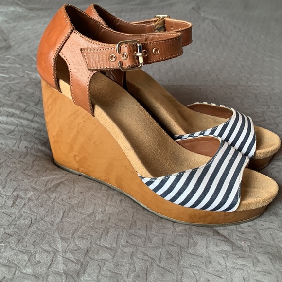 Navy and white stripes with tan/brown straps and soles. Buckle is gold. These are very comfortable for being wedges.