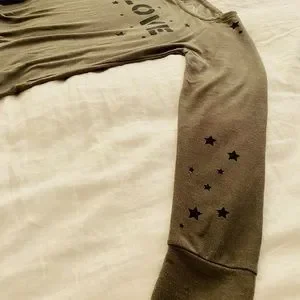 Chaser Sweatshirt. Olive green. Star accent graphics. Chaser cut out on collar. Cozy and lightweight.