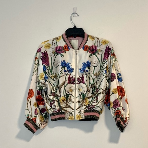 Gorgeous floral satin bomber jacket from Anthropologie brand, Elevenses. Lined with a beautiful lavender satin. Cropped fit with bubble sleeves.
